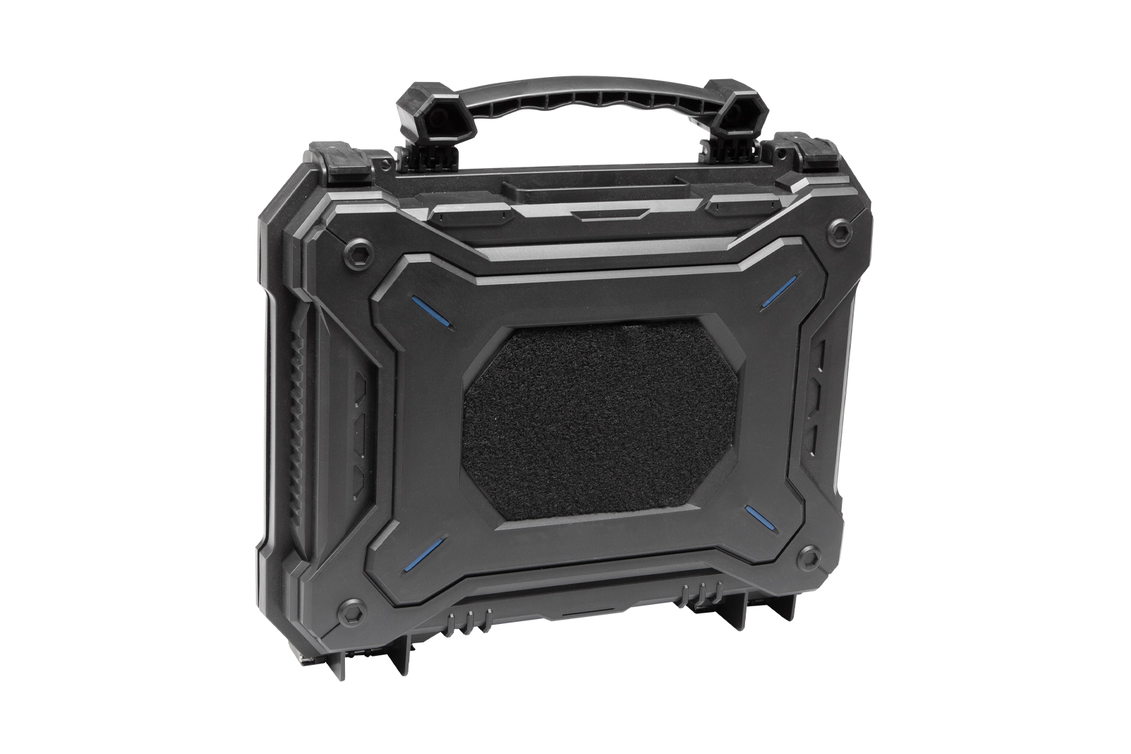 Durch seine Größe kann der Koffer problemlos jede Pistole miteiner Länge von bis zu 290 mm aufnehmen und bietet außerdemviel Platz für Zubehör, Ersatzmagazine, Akkus, uvm.In der schlagfesten Polymerhülle befinden sich weicheInnenschaumeinsätze, die den Inhalt vor Stößen während desTransports schützen.Pick and Pluck-Schaumstoffeinlagen sind im Lieferumfang enthalten,sodass Sie die Möglichkeit haben, die Einlage individuell anzupassen.An der Klettfäche am Außengehäuse können Sie problemlos ID-Patches,Team-Insignien oder andere Logos anbringen während blaue Akzente amGehäuse einen stilvollen Look erzeugen.