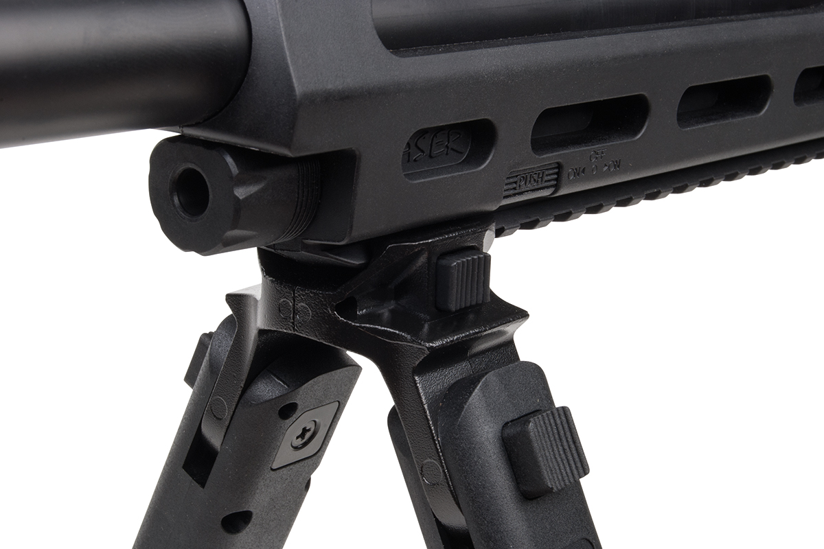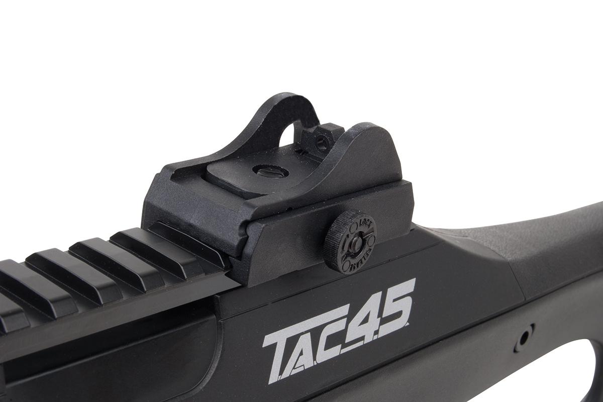 Das TAC 4.5 ist ein 21-schüssiges Luftgewehr mit einem hochwertigem Polymer-Body und einem Metall-Außenlauf im Sniper-Design. Das taktische Design ermöglicht dem Schützen eine Vielzahl an Variationsmöglichkeiten. Der ergonomische Lochschaft ist für Rechts- sowie Linksschützen geeignet. Durch das 21-Schuss Magazin ist ein langer Schießspaß vorprogrammiert. Das Model verfügt über zwei lange Railschienen, eine ventilierte Schaftkappe sowie eine abnehmbare Visierung. Die hintere Visierung ist zusätzlich einstellbar, vorne befindet sich ein Leuchtkorn. Ein einstellbares, klappbares Zweibein ist im Lieferumfang enthalten.