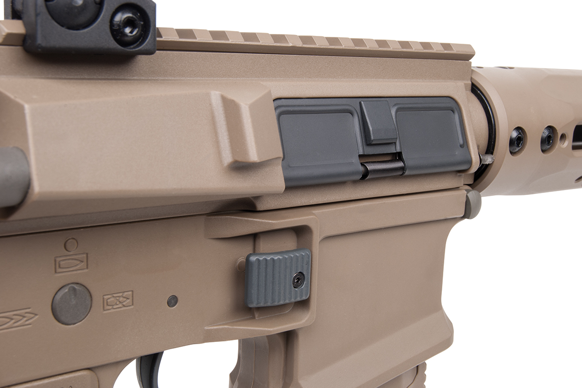 Die M4 009 ist natürlich mit dem beliebten Electronic Firing Control System (EFCS) ausgestattet. An der Oberseite befindet sich ein spezielles R.A.S.-System. Dank der Bohrungen können nach Belieben 21mm Schienen angebracht werden. Auch an der Unterseite befindet sich eine Railschiene. Das aufgesetzte Battle Sight Visier kann seitlich verstellt werden und verfügt über zwei Absehen. Dieses kann auch problemlos komplett abmontiert werden, sodass eine 21mm Railschiene zum Vorschein kommt, die sich ideal für das Anbringen von diversen anderen Zielgeräten eignet. Für optimierte Präzision lässt sich das Spin-Up, welches sich direkt unter dem Deko-Hülsenauswurffenster befindet, leicht verstellen.