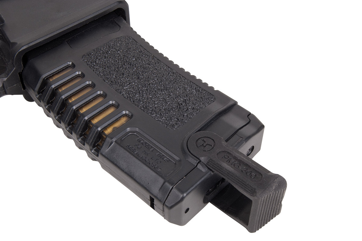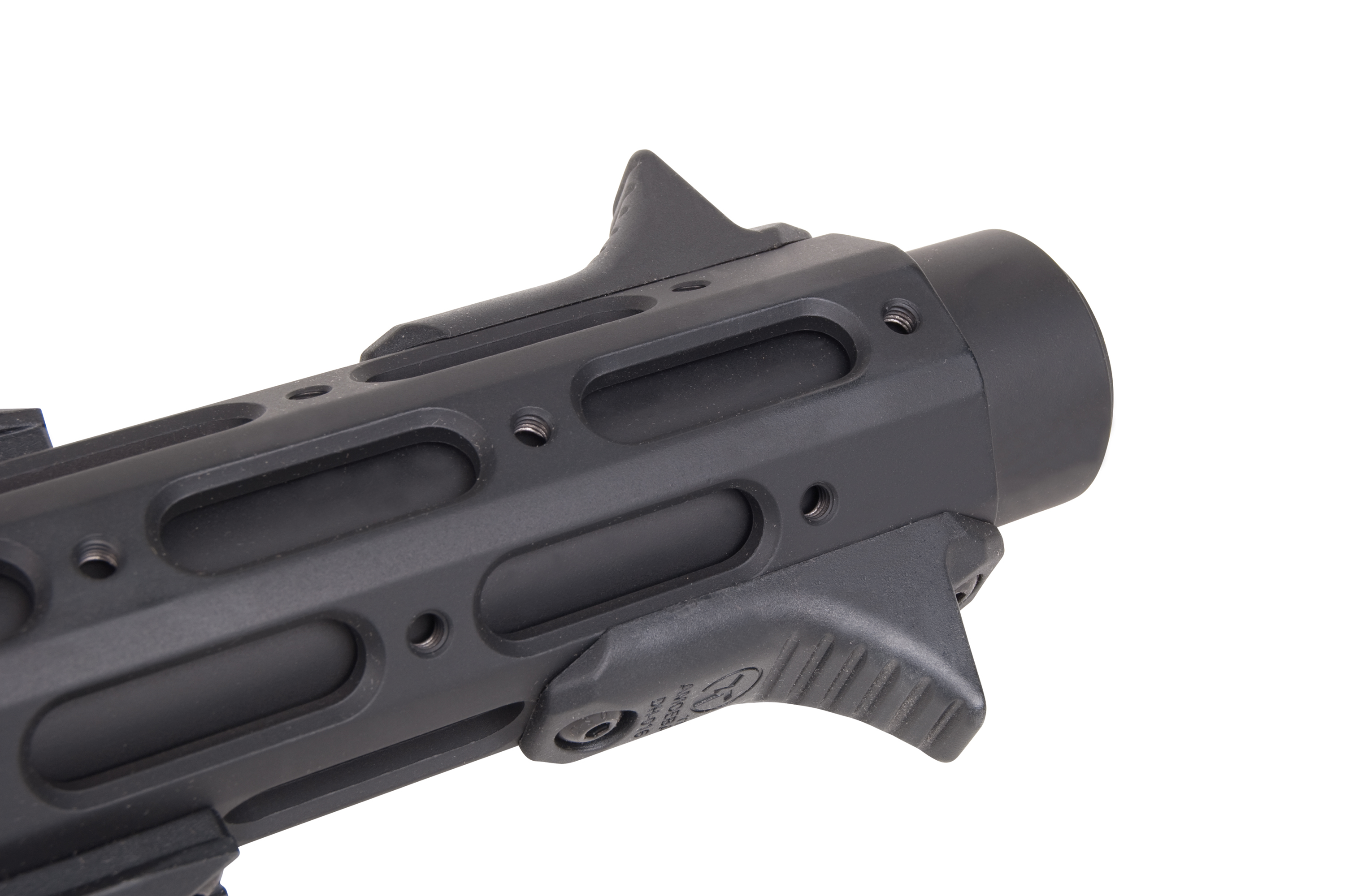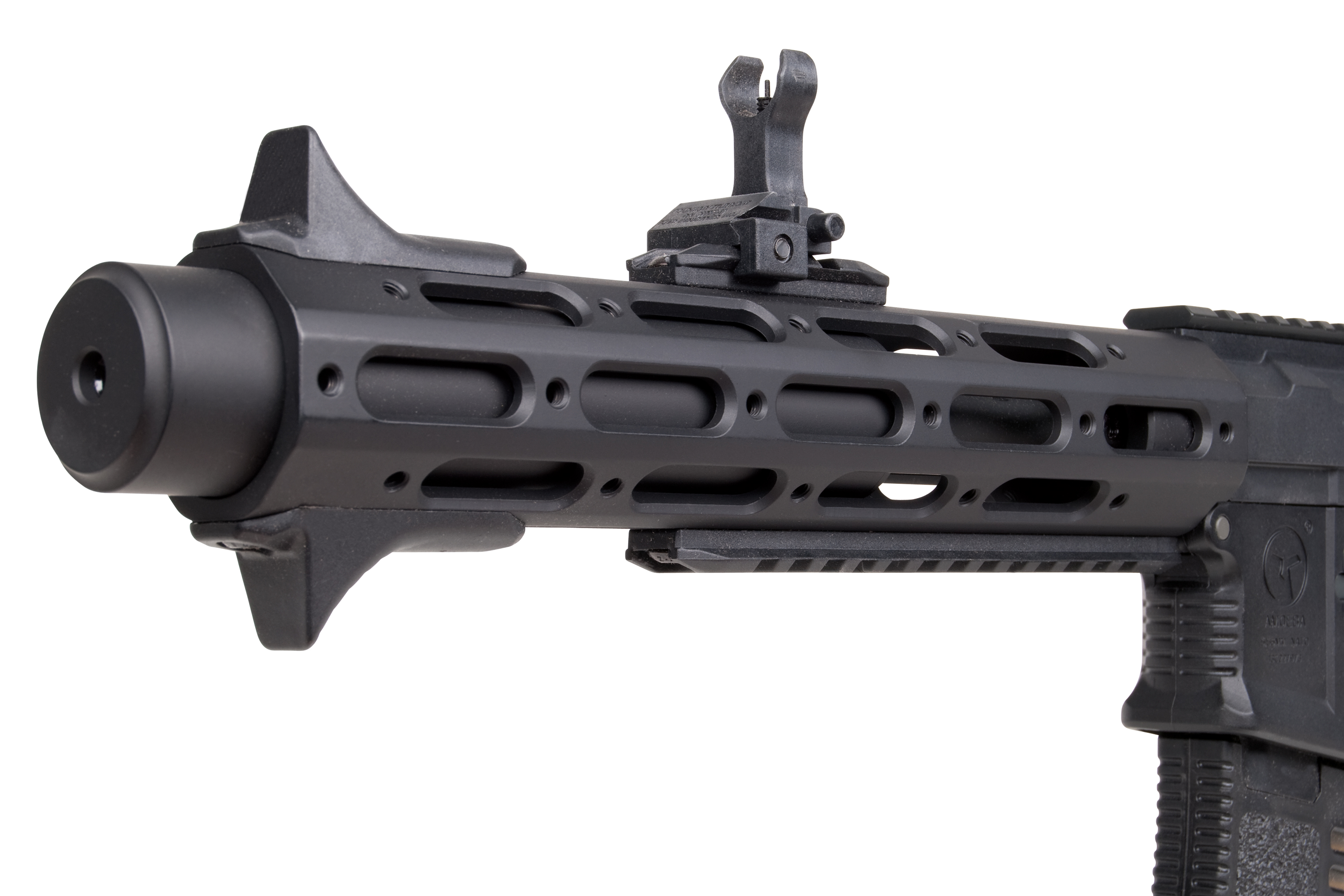 Die hochwertig verarbeitete S-AEG Waffe aus dem Hause ARES wird aus Nylon Fiber gefertigt. Der Vorderschaft besteht aus Metall. Sie verfügt über einen Schiebeschaft, eine Flip-Up Visierung, zwei Railschienen, einen Vorderschaft mit Handstopp, ein Schnellwechselmagazin und ein einstellbares Spin-Up System.