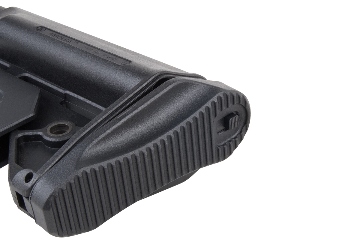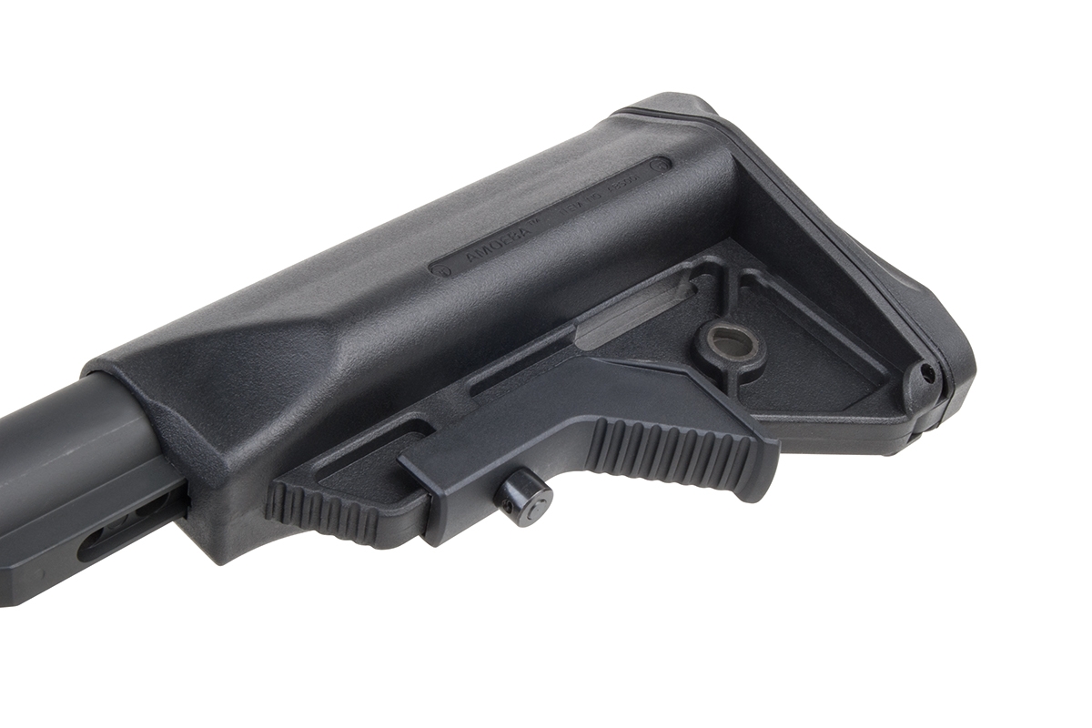 Die hochwertig verarbeitete AEG Waffe ist aus Nylon-Fiber gefertigt und ist Silencer-kompatibel. Sie bietet dir verschiedene Railschienen, einen Schiebeschaft, eine abnehmbare & einstellbare Visierung und ein einstellbares Spin-Up System. Dieses befindet sich unter dem Hülsenauswurffenster und kann sehr leicht eingestellt werden. Der abnehmbare Mündungfeuerdämpfer wird mit einem 13,5 mm Rechtsgewinde befestigt.