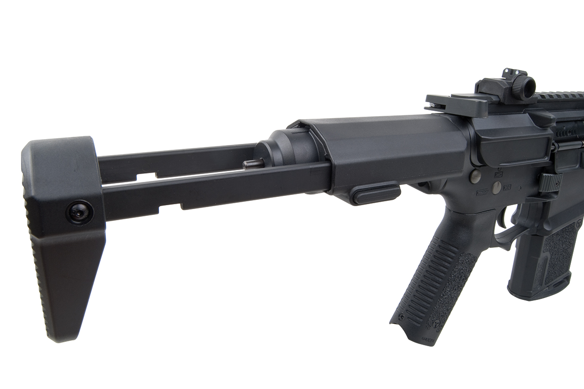 Die hochwertig verarbeitete S-AEG Waffe aus dem Hause ARES wird aus robustem Nylon Fiber gefertigt. Der Vorderschaft besteht aus Metall und ist mit einem Handstopp versehen. Den Schiebeschaft kannst du individuell einstellen oder auch komplett rausziehen, wenn z.B. der Akku getauscht werden muss. Bequemer Sitz im Anschlag dank der breiten und geriffelten Schulterstütze.