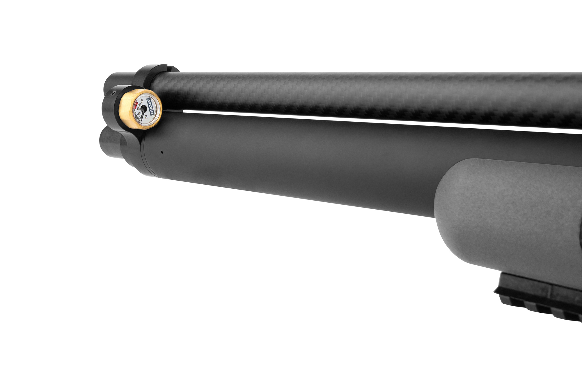 Das rotierbare Manometer ermöglicht eine direkte Druckkontrolle während des Schießens, ohne den Blick vom Ziel zu nehmen. Ein zweites Manometer für den Regulatordruck befindet sich bequem erreichbar an der rechten Seite des Gewehrs.