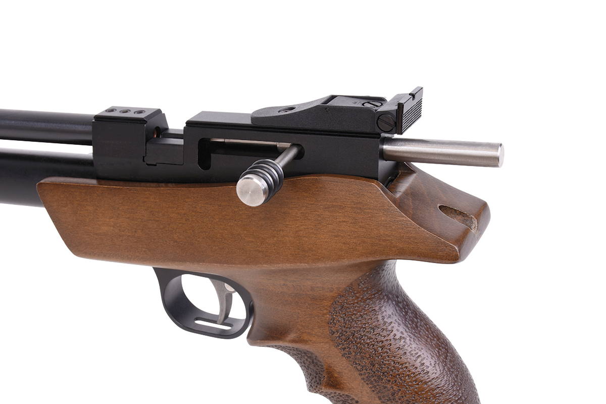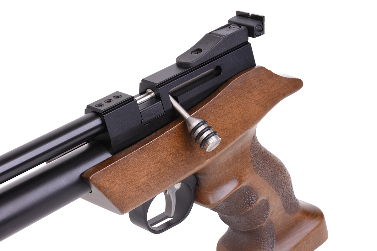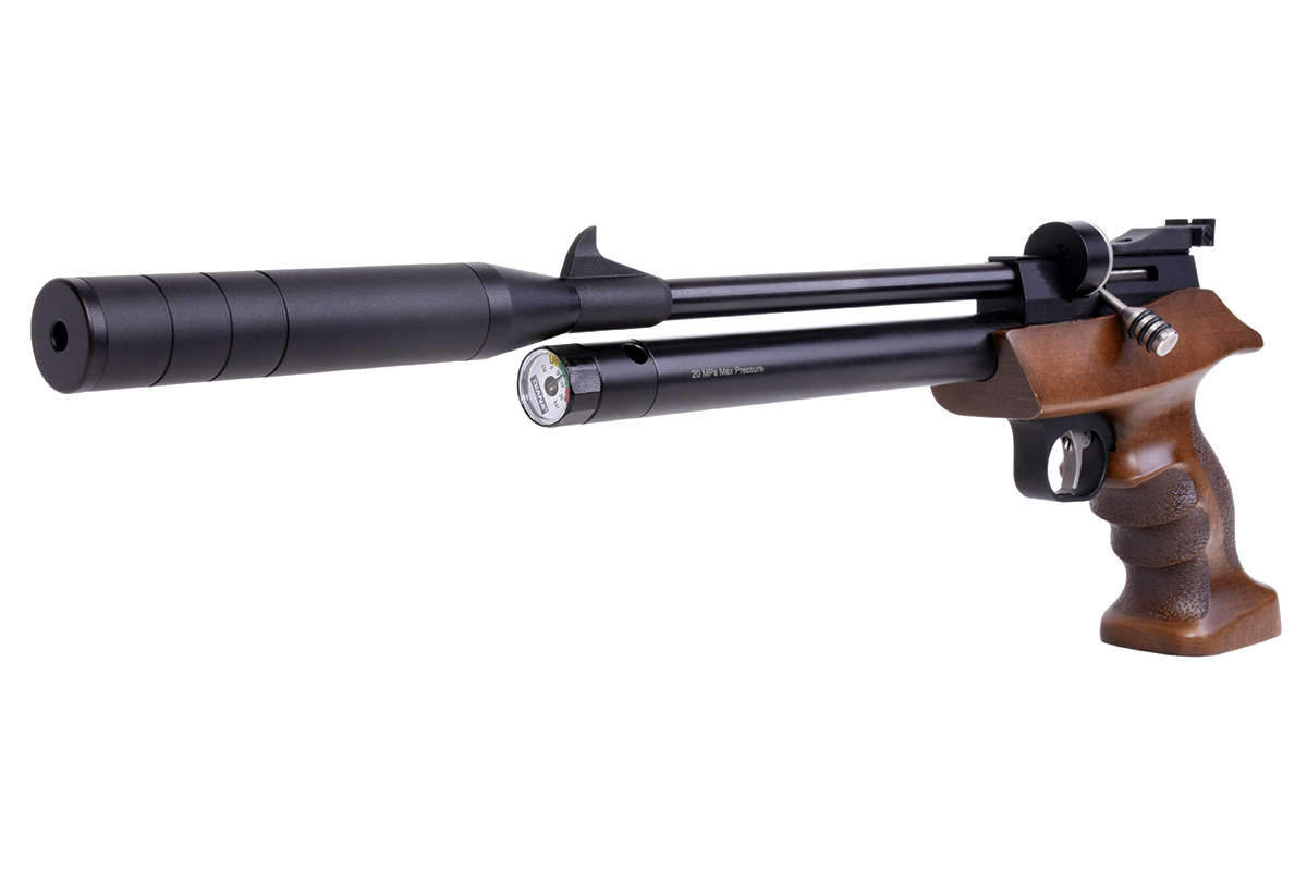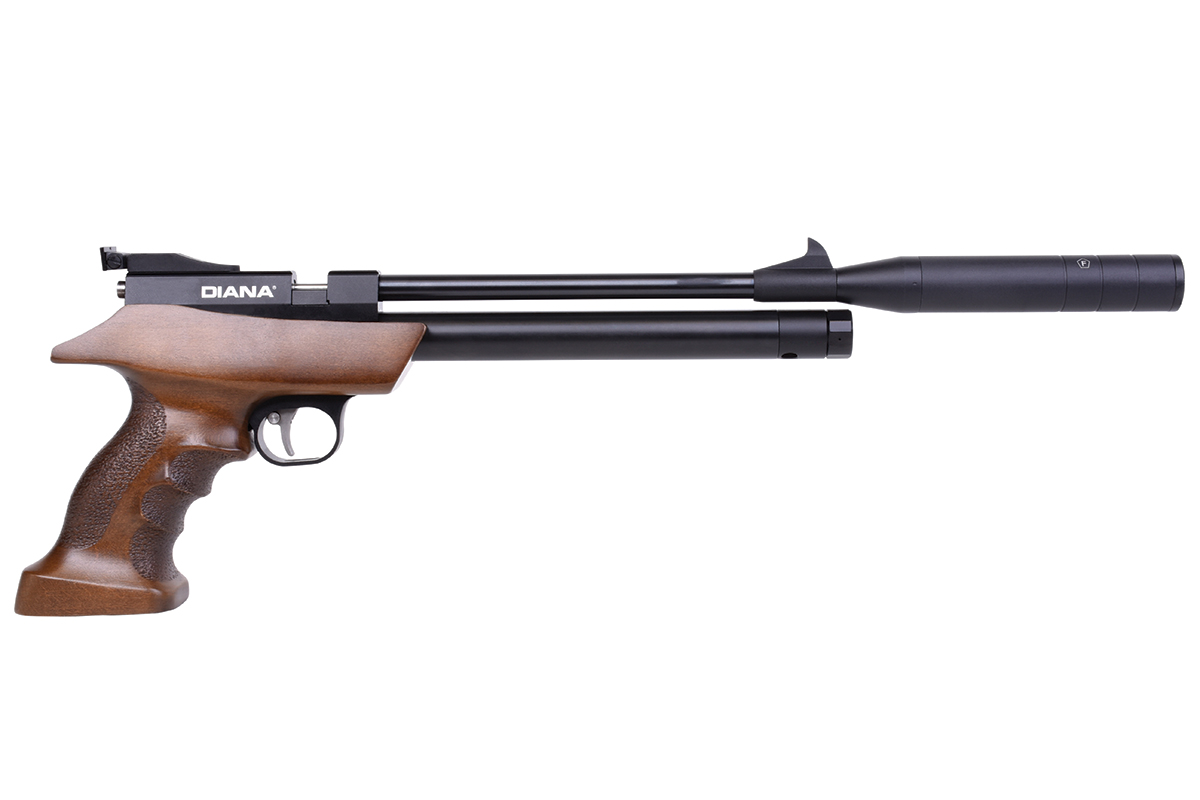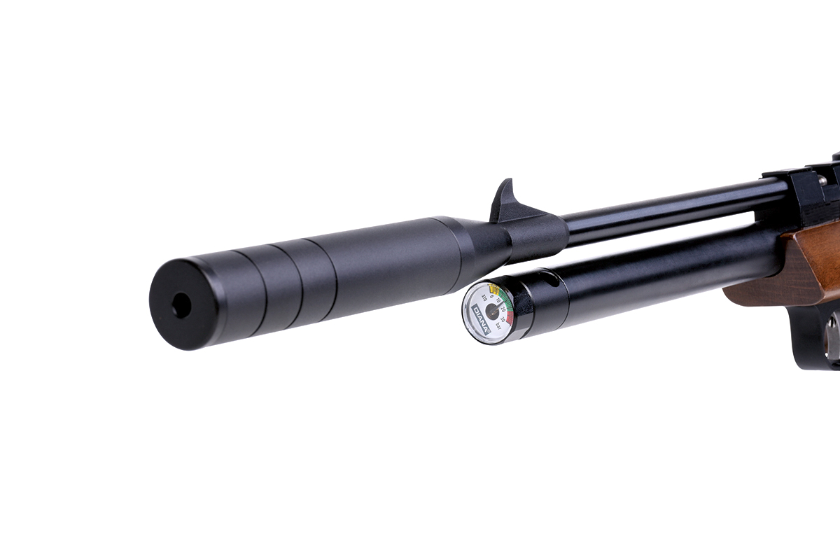 Die DIANA bandit mit integriertem Regulator ist eine leistungsstarke Pressluft-Pistole mit ergonomischen Buchenholz-Griffstück und aufgedrehtem Schalldämpfer. Die Pistole kann mit einer Einlage im Einzelschuss-Modus und mit einem 7-Schuss Trommelmagazin betrieben werden. Die gefräste Prismenschiene ermöglicht den Anbau einer passenden Optik. Der maximale Fülldruck beträgt 200 bar.