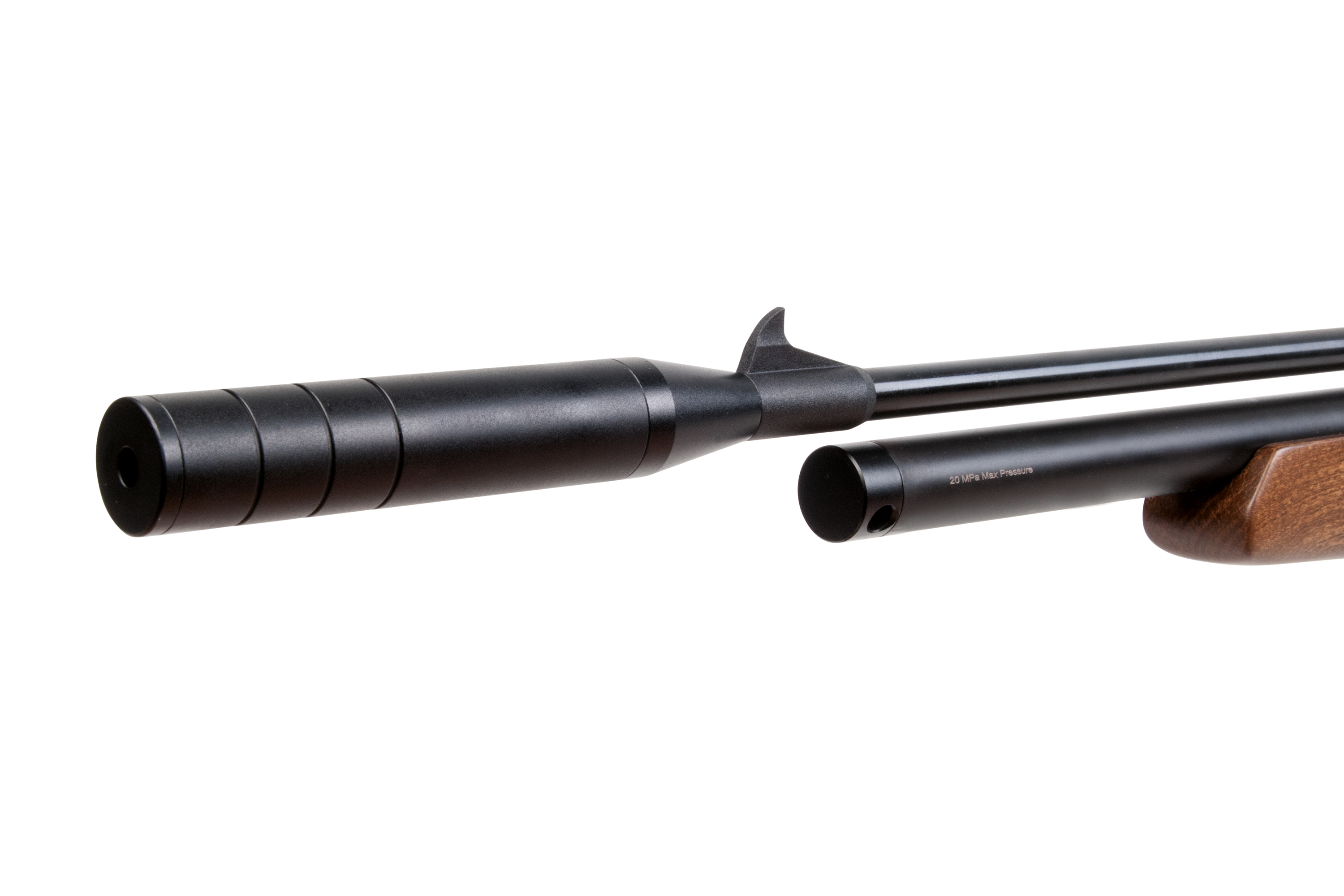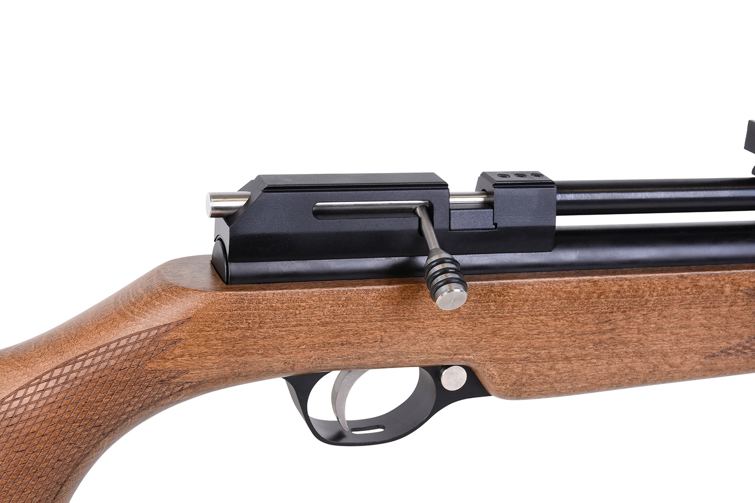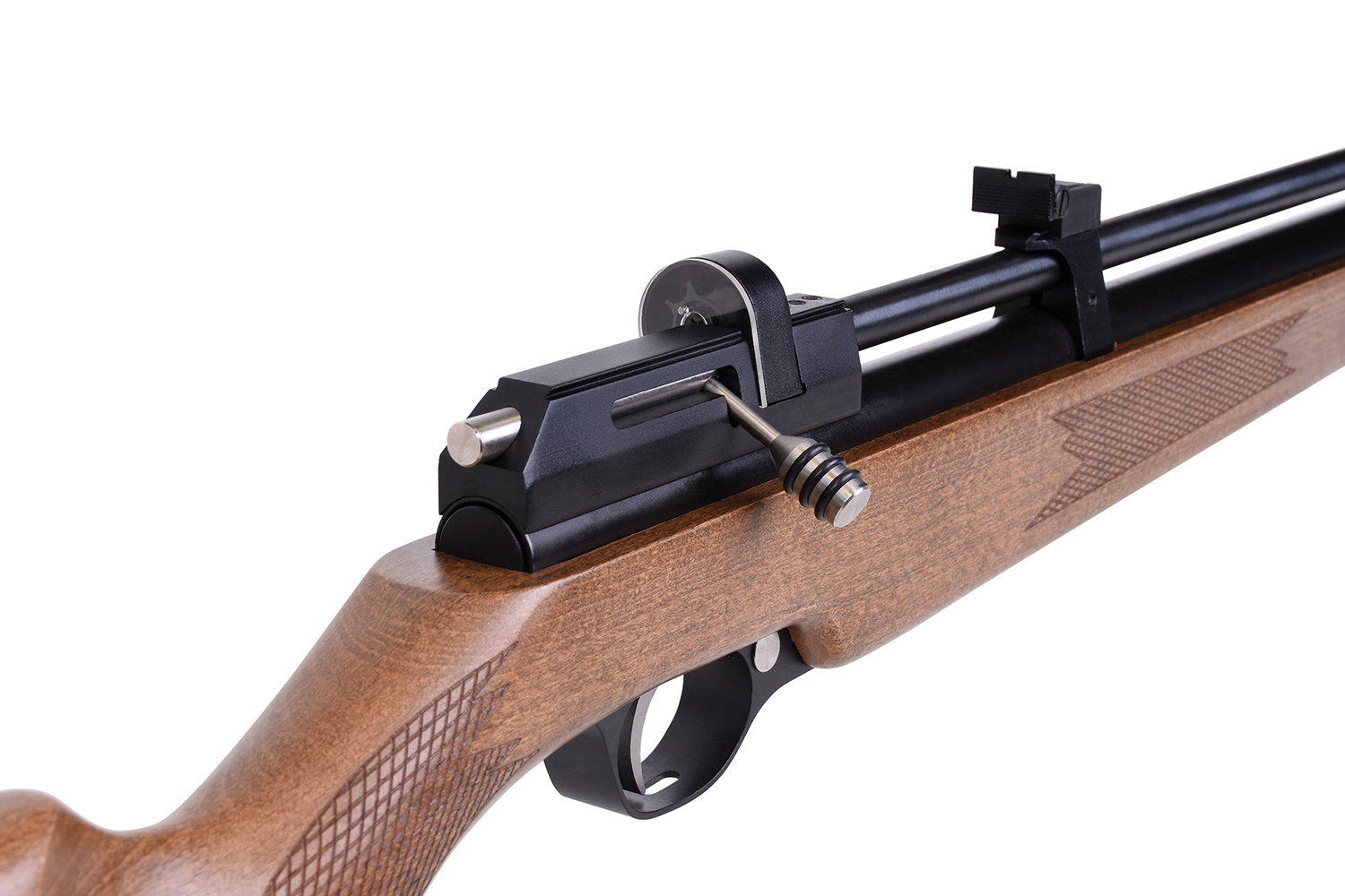 Das Modell verfügt über eine gefräste Prismenschiene, einen Schalldämpfer, eine einstellbare Mikrometer-Visierung, eine gummierte Schaftkappe und eine manuelle Sicherung.