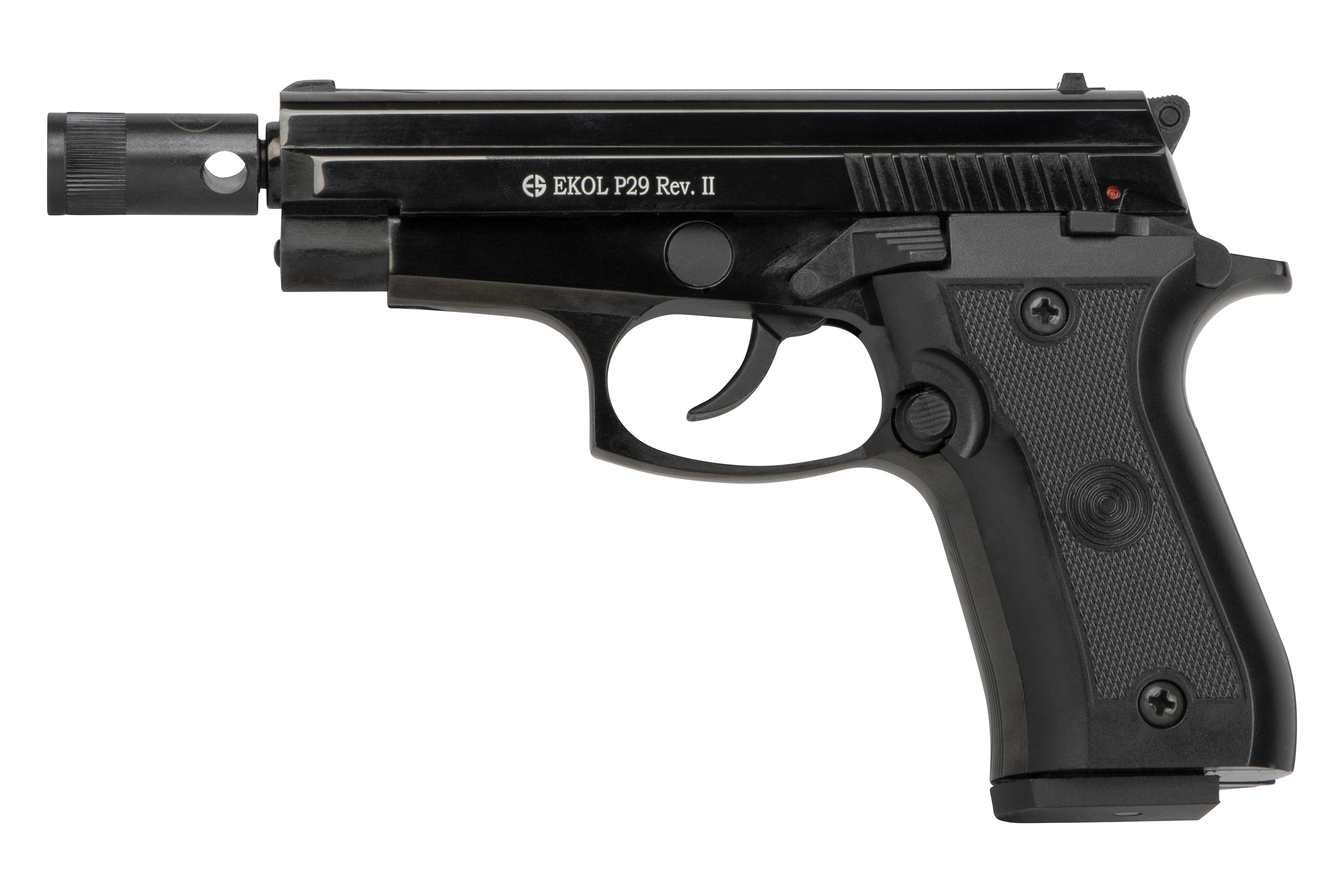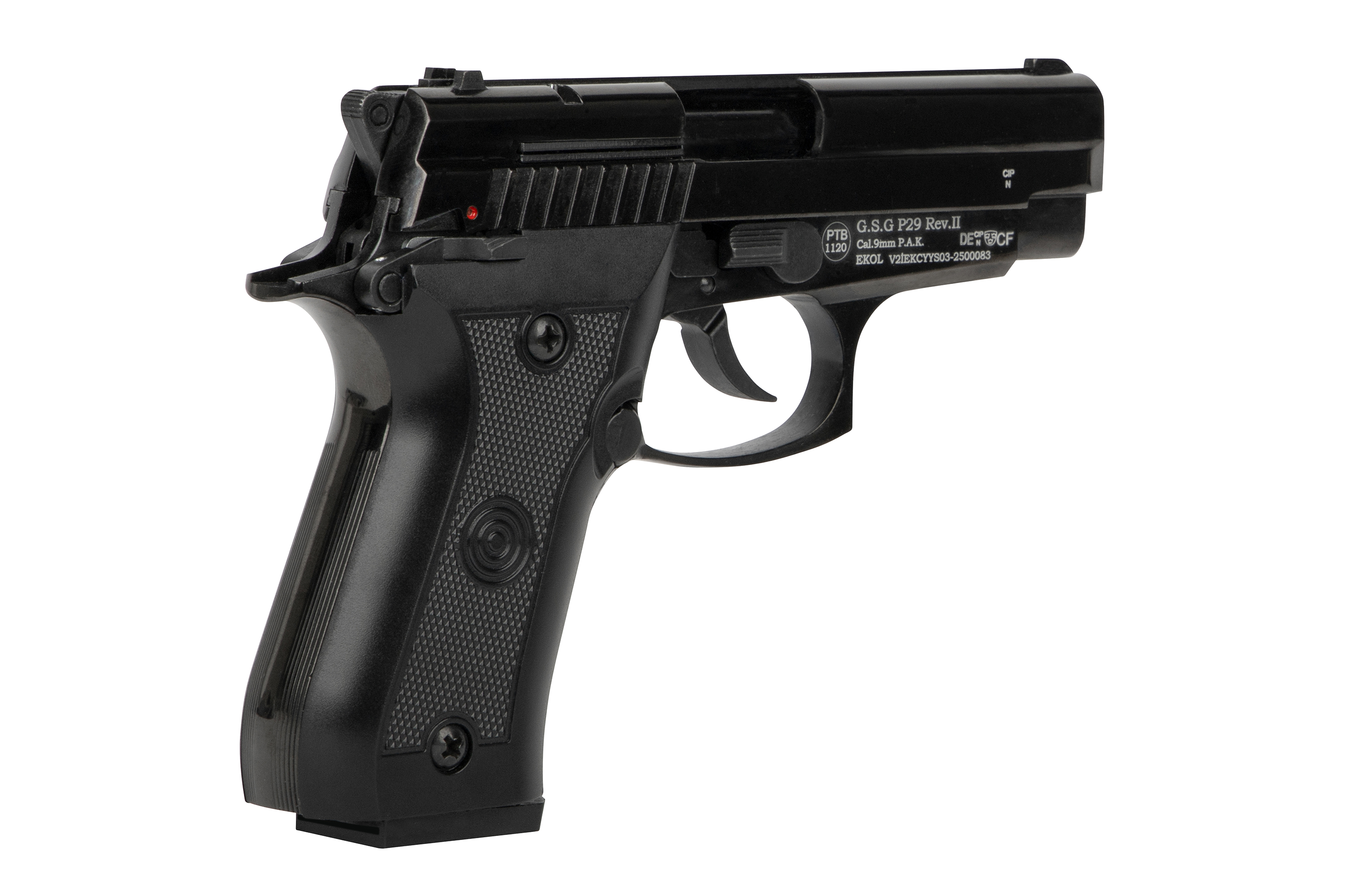 Die Ekol P29 ist eine zuverlässige Gas-Signal-Pistole im Kaliber 9mm P.A.K., die sich durch ihre kompakte Bauweise, hochwertige Verarbeitung und realistische Handhabung auszeichnet. Mit ihrem klassischen Design und der robusten Konstruktion eignet sie sich perfekt für den Einsatz an Silvester, zur Selbstverteidigung mit Gas- oder Pfefferpatronen sowie für Signalmunition.