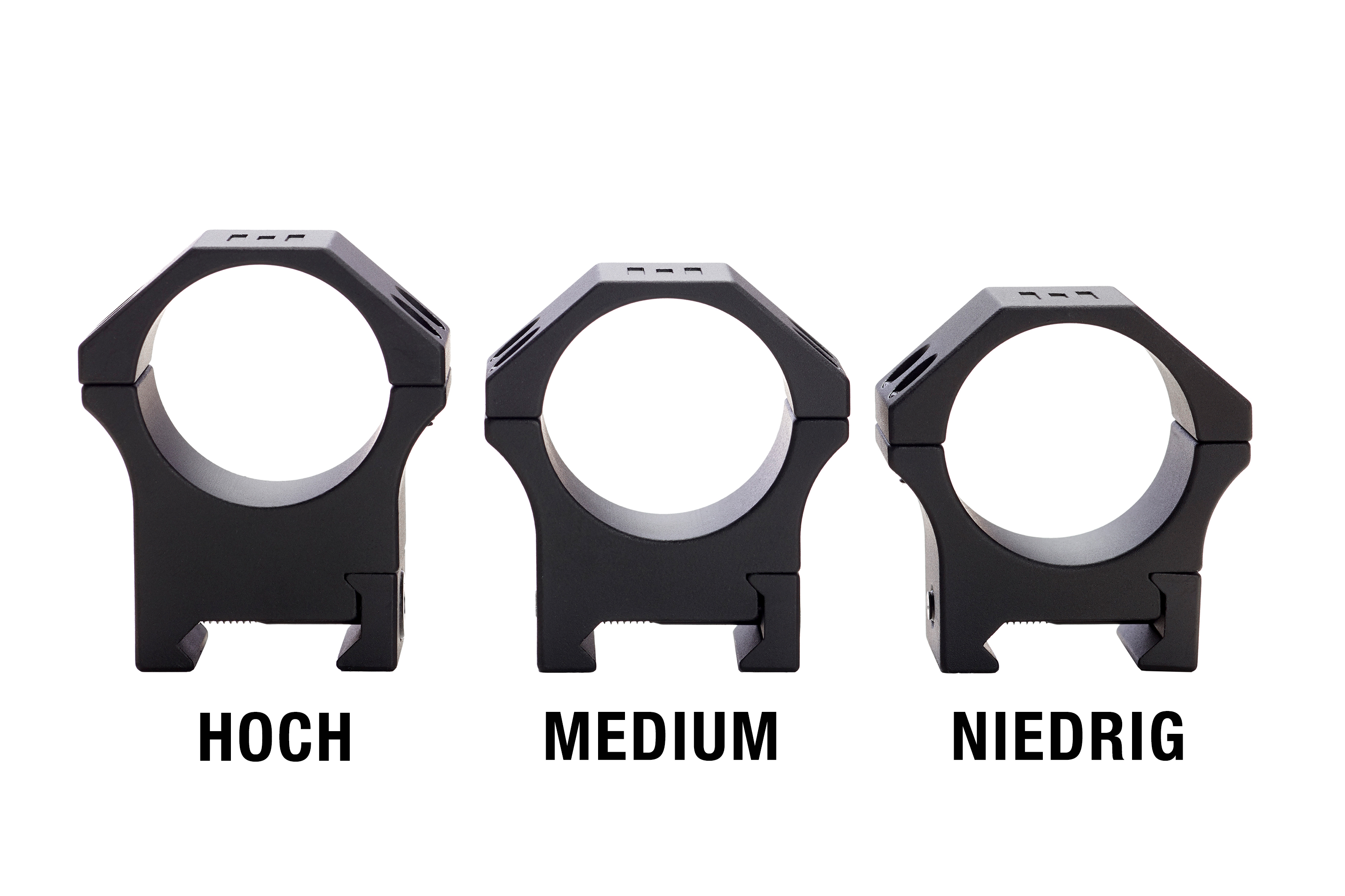 Die XT-Montageringe sind in verschiedenen Bauhöhen sowohl für Picatinny- (22 mm) als auch Prismenschienen (11 mm) verfügbar und sowohl für 1"- als auch 30mm-Mittelrohre erhältlich.