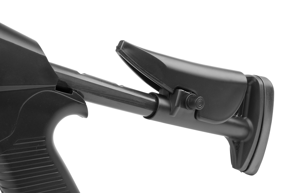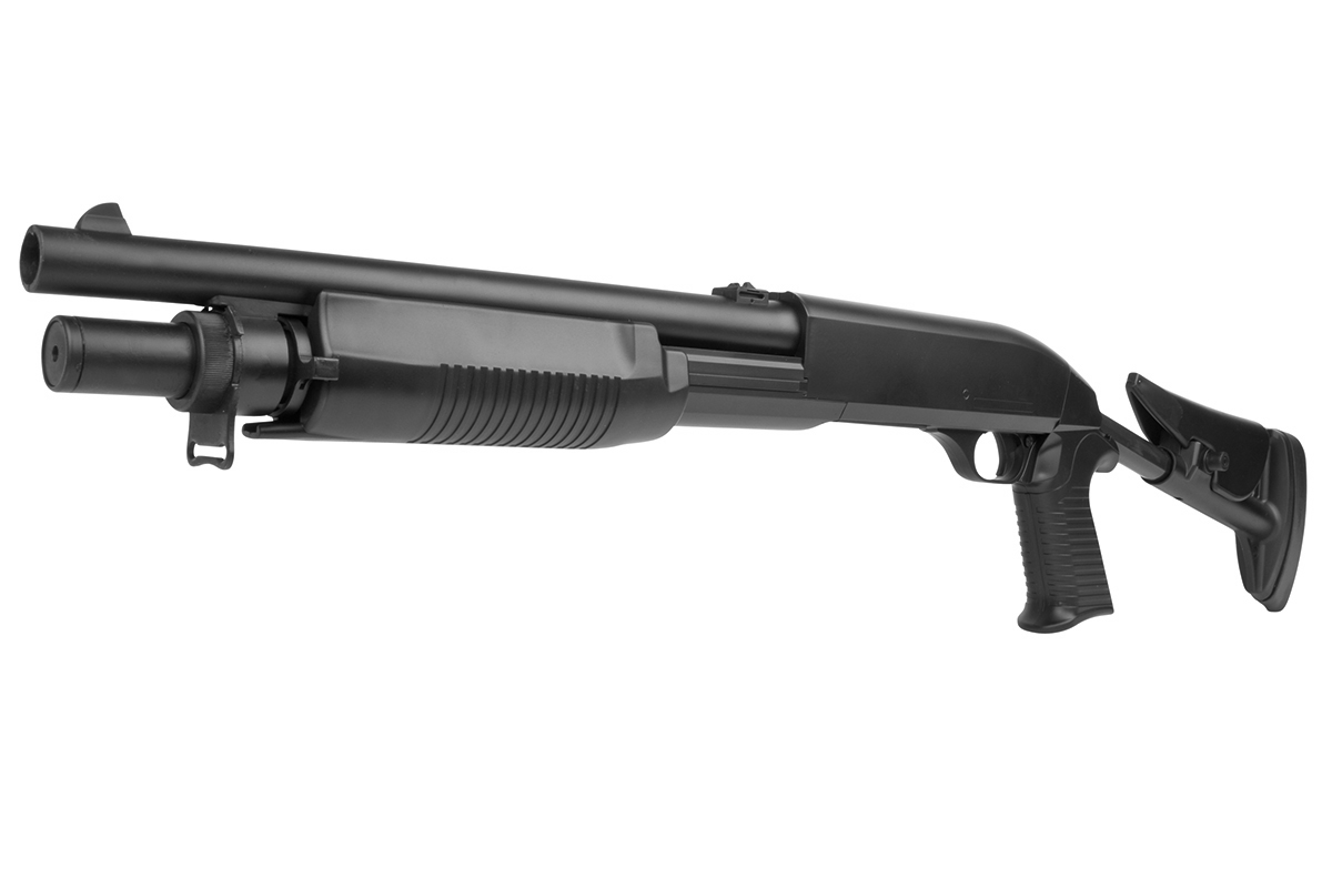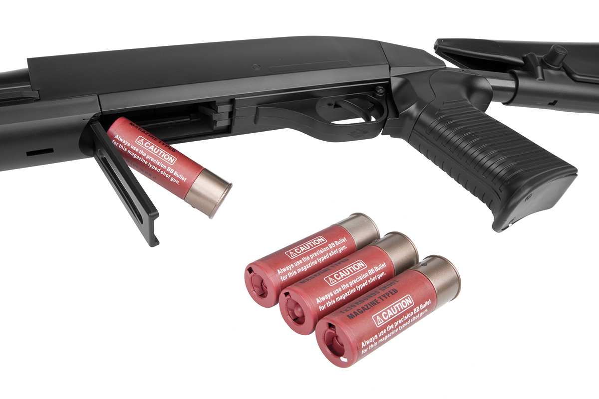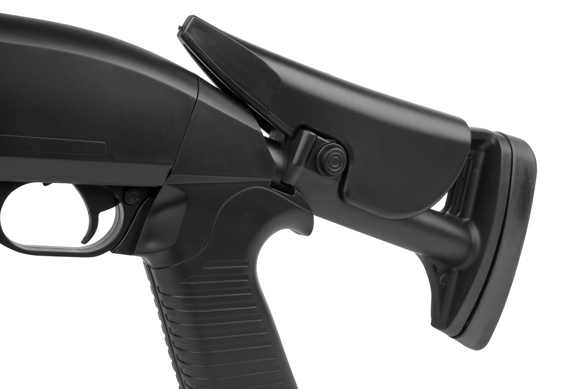 Der gelungene Nachbau mit Federdrucksystem aus dem Hause ASG, mit einer Energie von < 1,6 Joule, verfügt über einen flexiblen Schiebeschaft mit Wangenauflage, einen Pistolengriff, einen Innenlauf und einen Hülsenclip. Das Gewehr wird inklusive 4 Shot Shells ausgeliefert. Das einstellbare Spin-Up System sorgt für ein verbessertes Trefferbild.