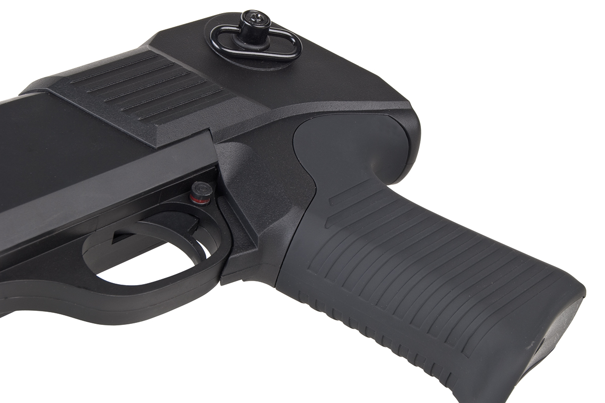 Der kurze Nachbau mit Federdrucksystem aus dem Hause ASG mit einer Energie von ca. 0,7 Joule verfügt über einen Pistolengriff und 3 Innenläufe. Das Gewehr wird inklusive Speedloader, Trageriemen und 2 Hülsen ausgeliefert.