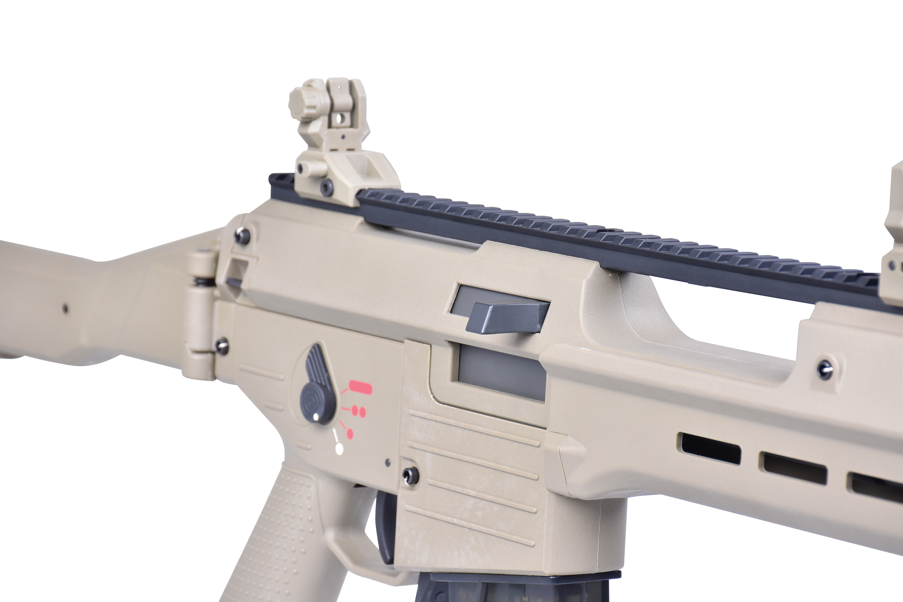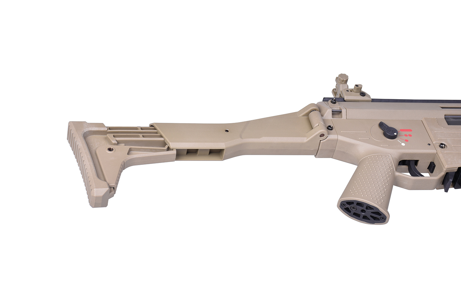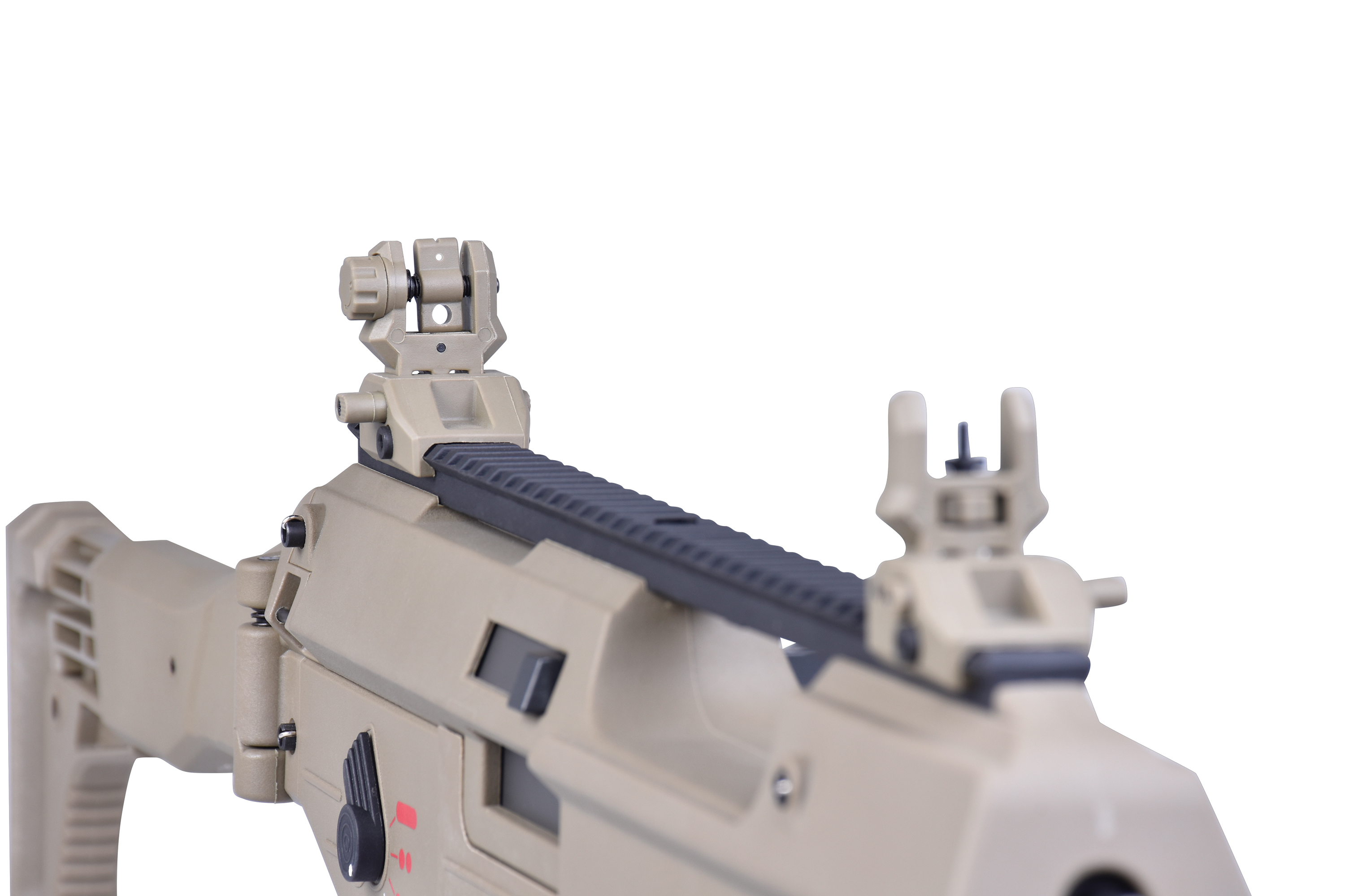 Weiterhin bietet das Modell einen neu designten Klappschaft mit verstellbarer Schulterstütze, eine einstellbare Flip-Up Visierung, ein Anti-Slip Griffstück und ein einstellbares Hop-Up System für ein optimiertes Trefferbild.