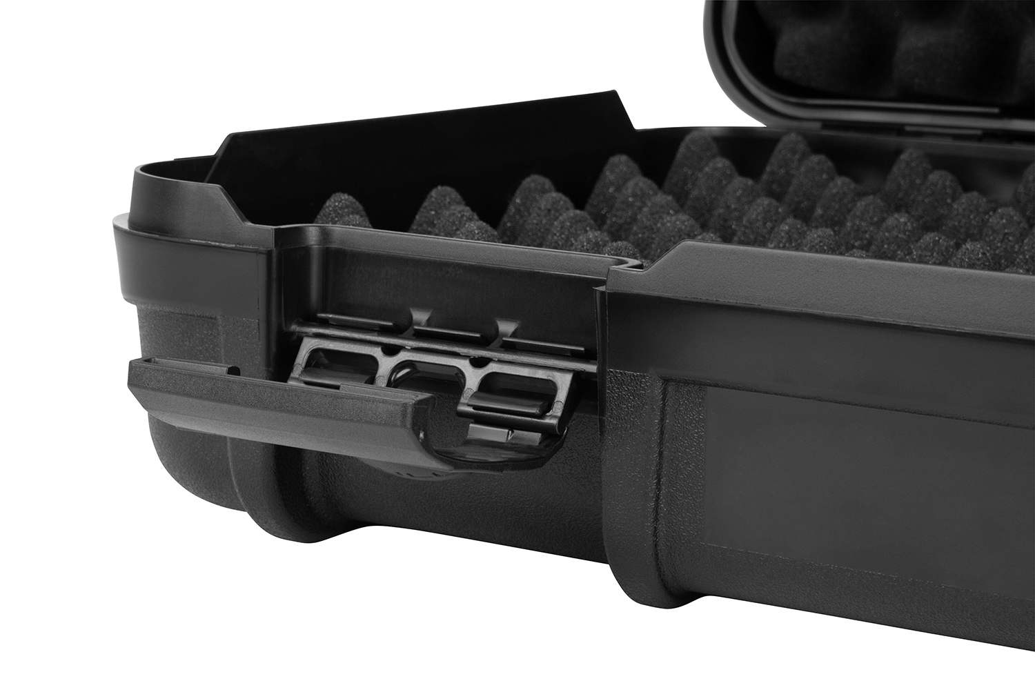 Der Innenraum ist mit vorgeformtem Noppenschaumstoff ausgestattet, der sich der Ausrüstung perfekt anpasst. Dadurch bleibt alles sicher fixiert, ohne zu verrutschen. Durch zwei Kunststoffösen kann er per Vorhängeschloss verschlossen werden kann.