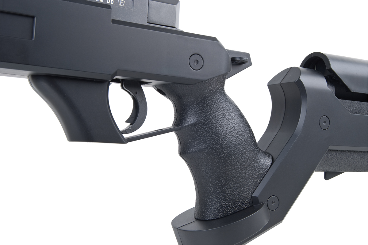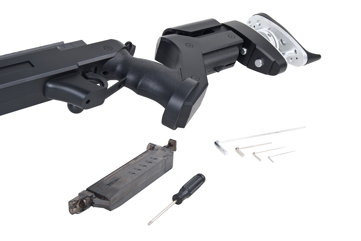 Der sehr gelungene Nachbau mit Federdrucksystem und einer Energie von ca. 1,8 Joule verfügt über eine einstellbare Schulterstütze und Schaftbacke, ein integriertes Zweibein, einen Speedloader, einen Tragegurt, eine Railschiene und das bewährte Spin-Up System für Präzision auf höchstem Niveau.