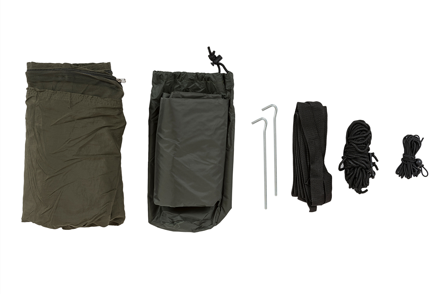 Material: Polyamid. Netzgewebe – Polyester. Plane – Polyester. Abspannleinen – Polyester. Heringe – Stahl. Gurtband – Polypropylen