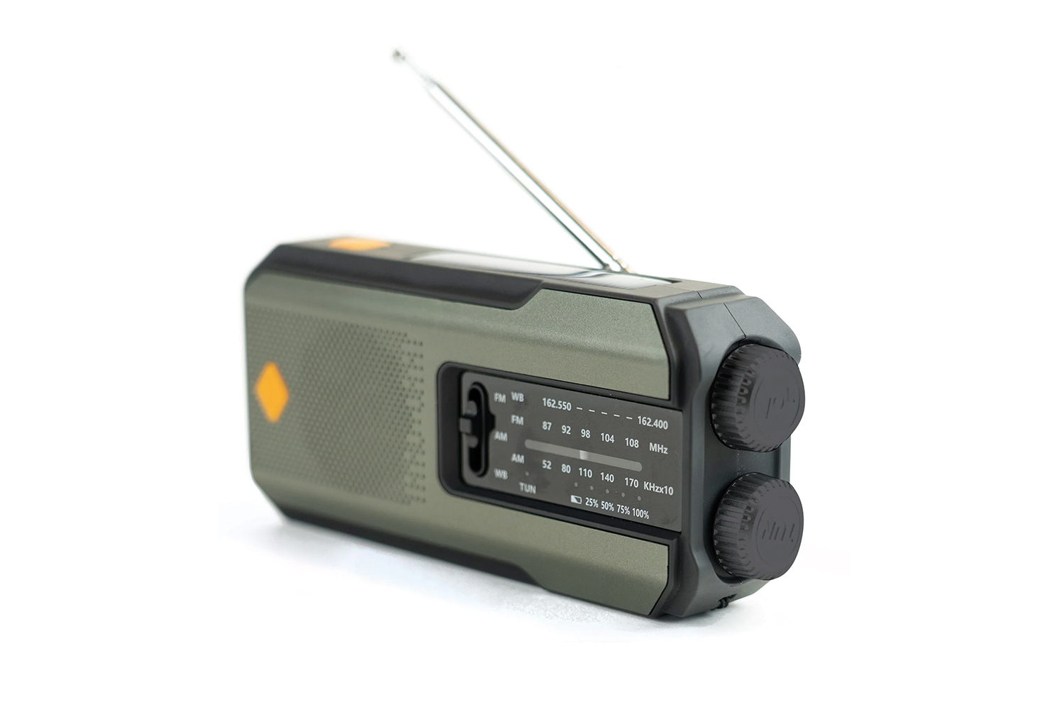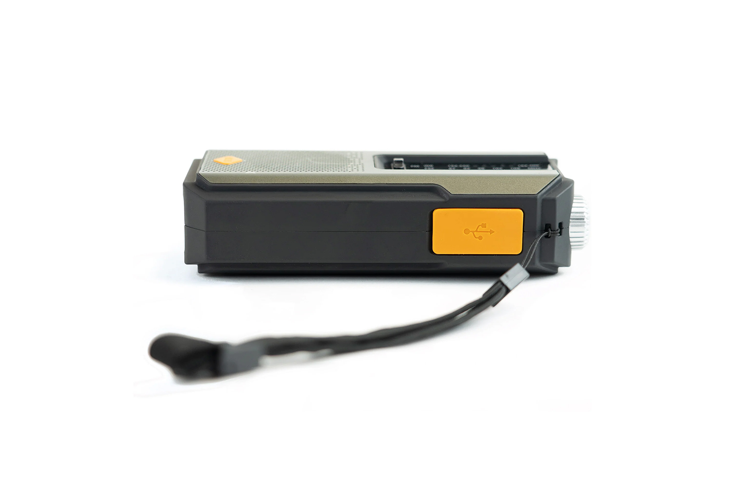 Durch Handkurbel, Solarpanel und USB-Ladeoption bleibt das Gerät unabhängig von externer Stromversorgung einsetzbar.