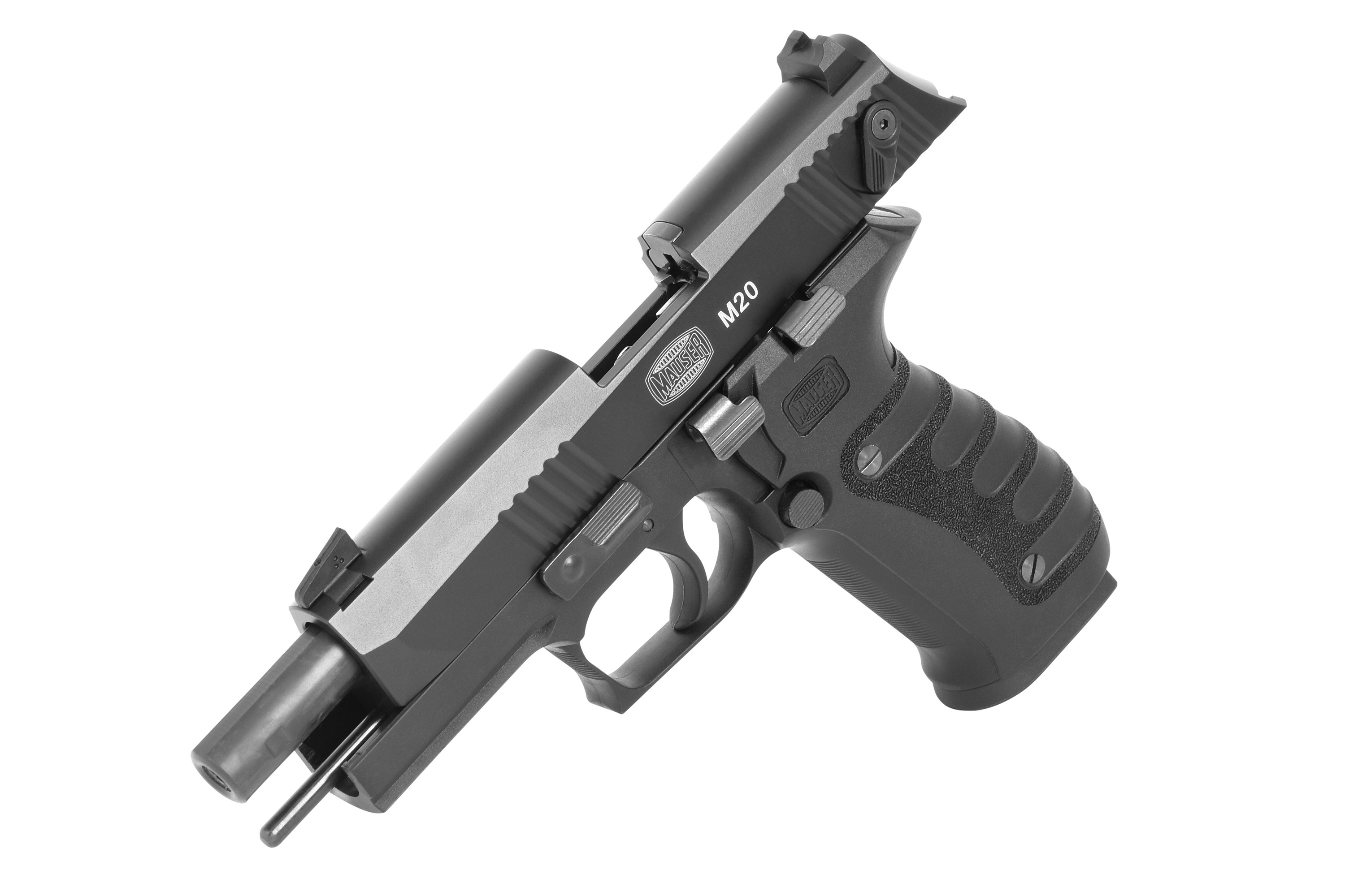 Die Mauser M20 verfügt über einen CNC gefrästen Aluminiumschlitten und ermöglicht somit den Einsatz auch schwächer geladener Standard-Munition bis hin zu HV Munition und deckt somit die ganze Bandbreite der unterschiedlichen Laborierungen ab. Ausgestattet mit einem ergonomischen Polymer Griffstück und schwarzen Kunststoff Griffschalen, Single – und Double-Action Abzug, Picatinny-Schiene zur Anbringung einer Brückenmontage, Metallmagazin, beidseitiger Flügelsicherung, Entspannhebel und einstellbarer Visierung.