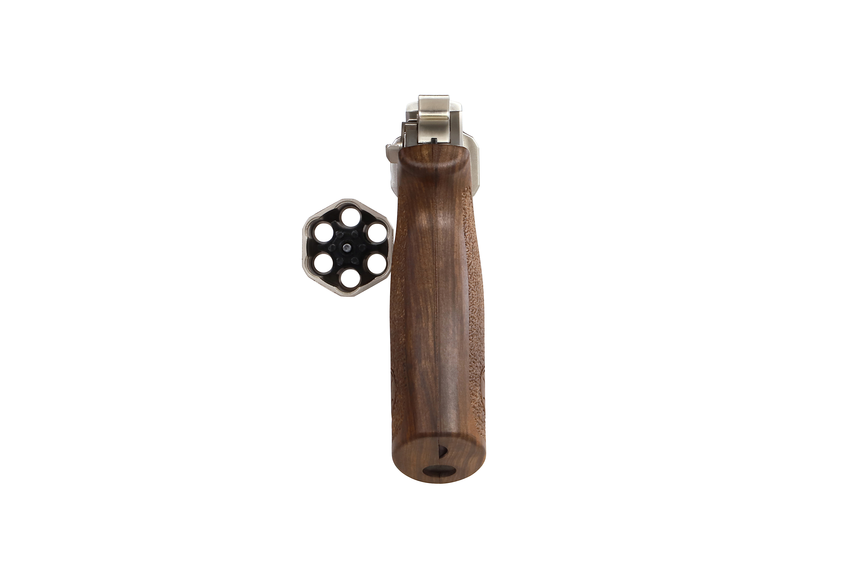Die Waffe ist sauber verarbeitet und lässt sich auf Grund Ihres hohen Gewichts gut handeln. Sie verfügt über eine aktive Laufverriegelung und eine Ladestandanzeige. Optionales Zubehör lässt sich ganz einfach an der Railschiene montieren. Der Revolver ist mit einer Fiber-Optik Visierung ausgestattet, die sich sowohl horizontal als auch vertikal verstellen lässt. Praktischerweise ist der Inbusschlüssel für die Kartuschen-Andruckschraube in der Griffschale integriert. Der Trommel Release ist nur von links bedienbar.