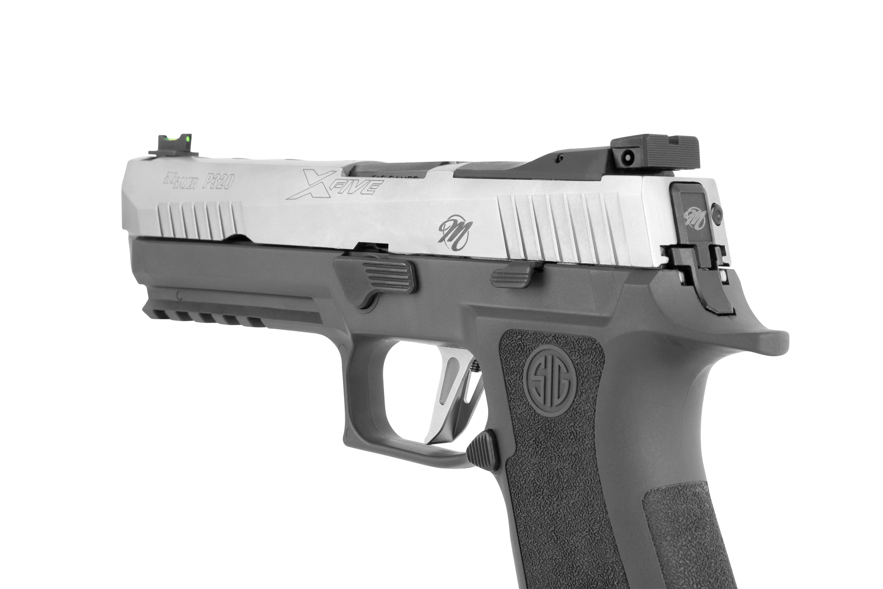 Die Full-Size Pistole SIG SAUER P320 XFIVE Legion verfügt über eine einstellbare Kontrast-Visierung, eine graue LEGION-Beschichtung für sehr gute Kratz- und Verschleißfestigkeit, ein Griffstück und einen Schlitten aus Edelstahl, das TXG Tungsten Infused Heavy X Griff-Modul, einen verlängerten Beavertail, die Henning Group Aluminum Basepads, einen Lauf aus Carbon-Stahl, ein Stahl-Magazin, einen skelettierter Abzug sowie eine Picatinny-Schiene.