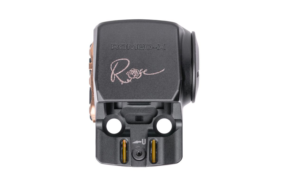 Das seitlich angebrachte Batteriefach und das innovative Höhen- und Seitenverstellsystem auf Basis einer Berylliumkupfer-Feder ermöglichen die ultraniedrige Bauhöhe des ROMEO-X und dadurch eine optimierte Deutschuss-Eigenschaft und die gleichzeitige Möglichkeit zur Nutzung der Notfall-/Standard-Visierung.