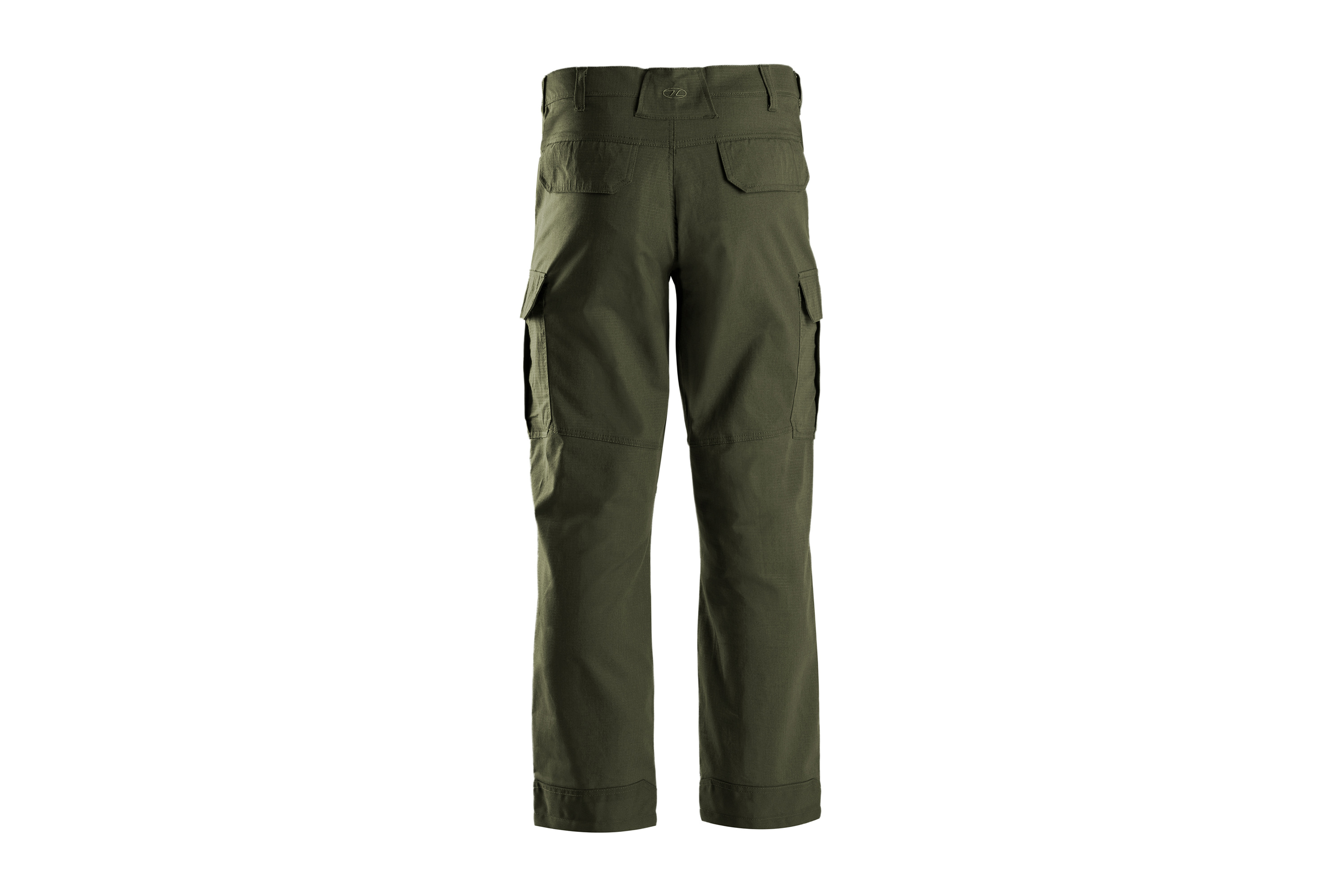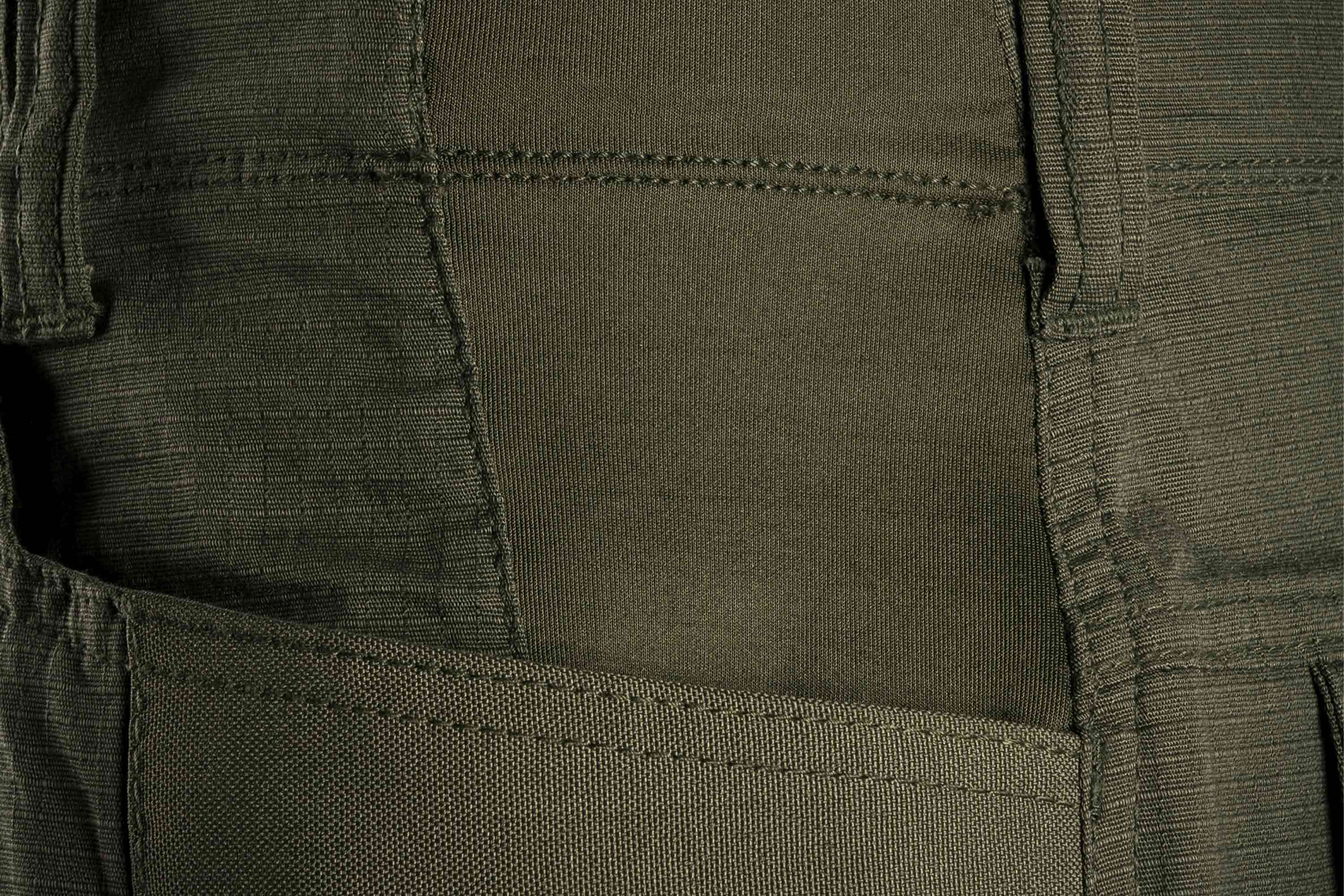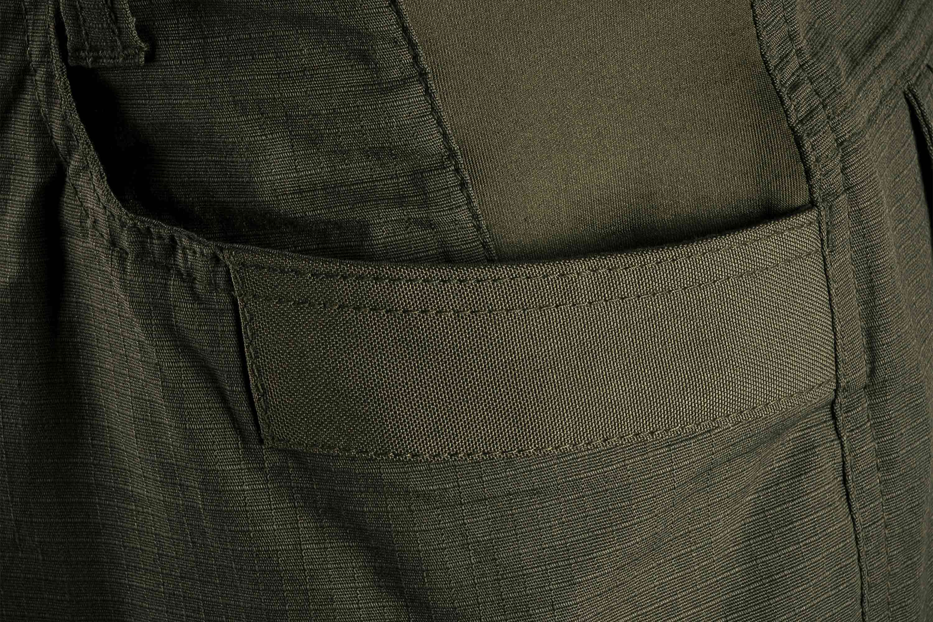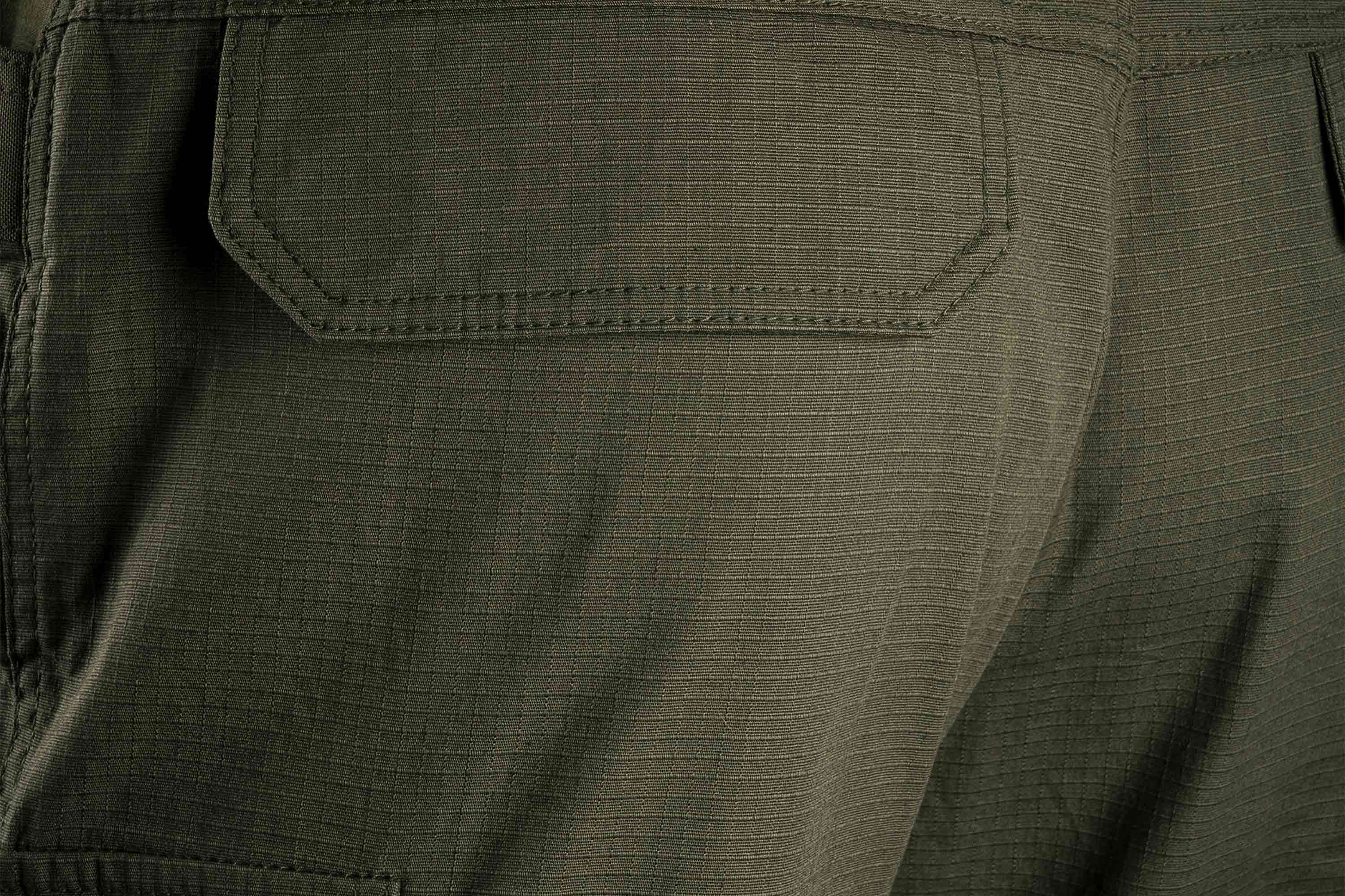 Die Hose besteht aus einem widerstandsfähigen Micro-Ripstop-Gewebe mit Stretch-Anteil. Dieses Material ist besonders robust und reduziert durch seine spezielle Struktur das Weiterreißen von Beschädigungen. Eine zusätzliche Teflon-Beschichtung erhöht die Widerstandsfähigkeit gegenüber Schmutz und Feuchtigkeit.