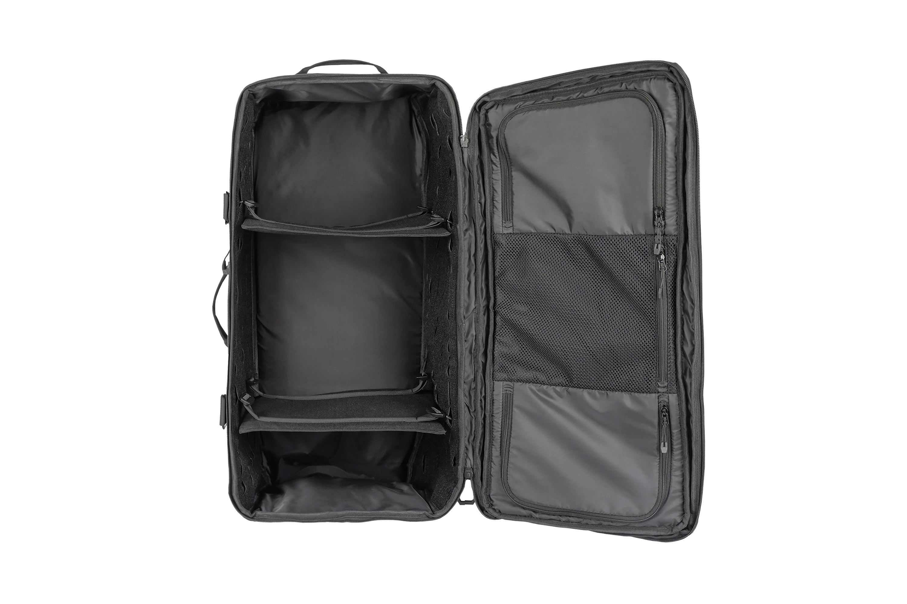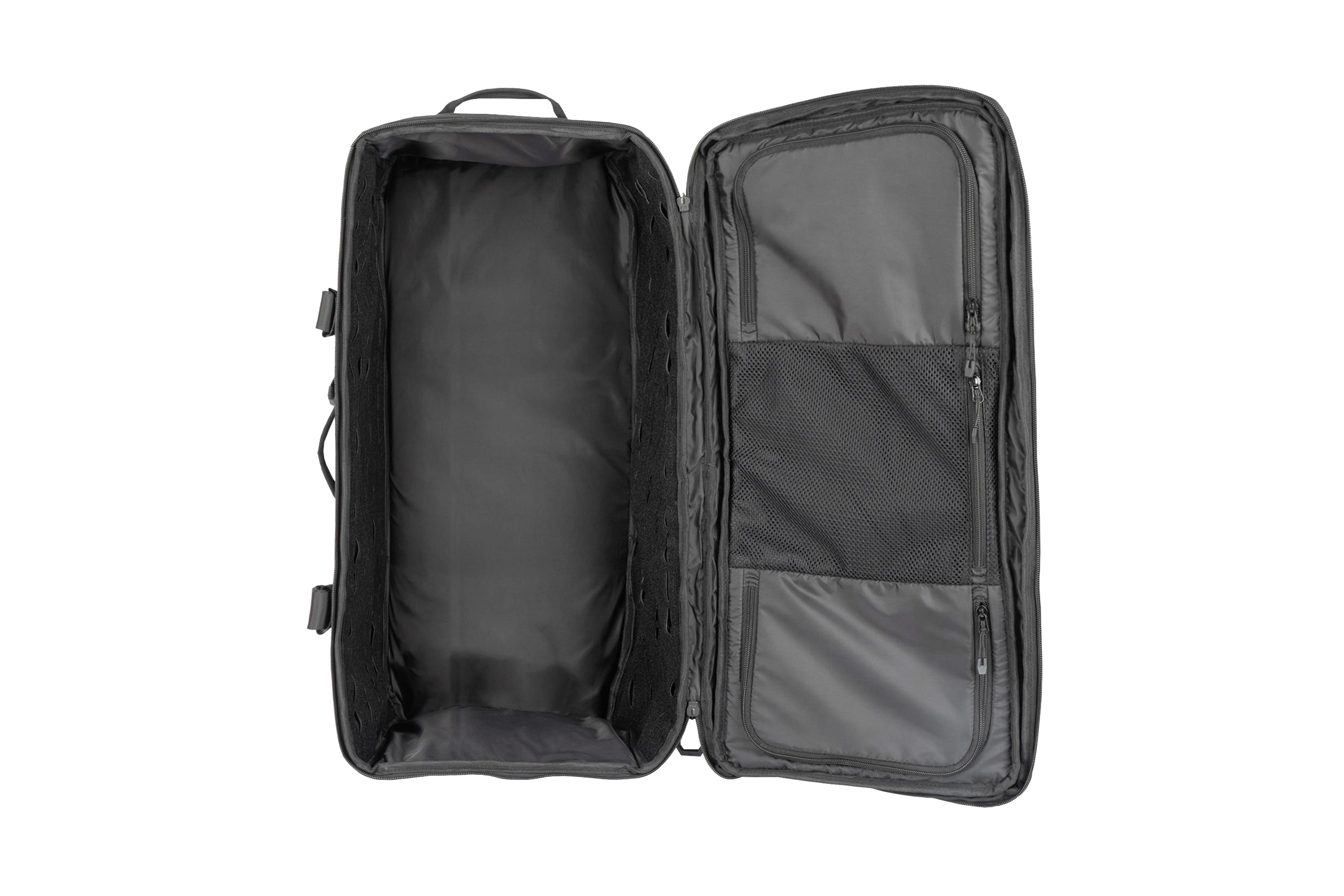 Im Inneren befinden sich MOLLE-kompatible Klettflächen an den Seiten, an denen zusätzliche Taschen oder Panels befestigt werden können. Zwei herausnehmbare Trennwände mit Duraflex Phantom G-Hooks ermöglichen eine flexible Unterteilung des Innenraums und sorgen für eine strukturierte Organisation der Ausrüstung.