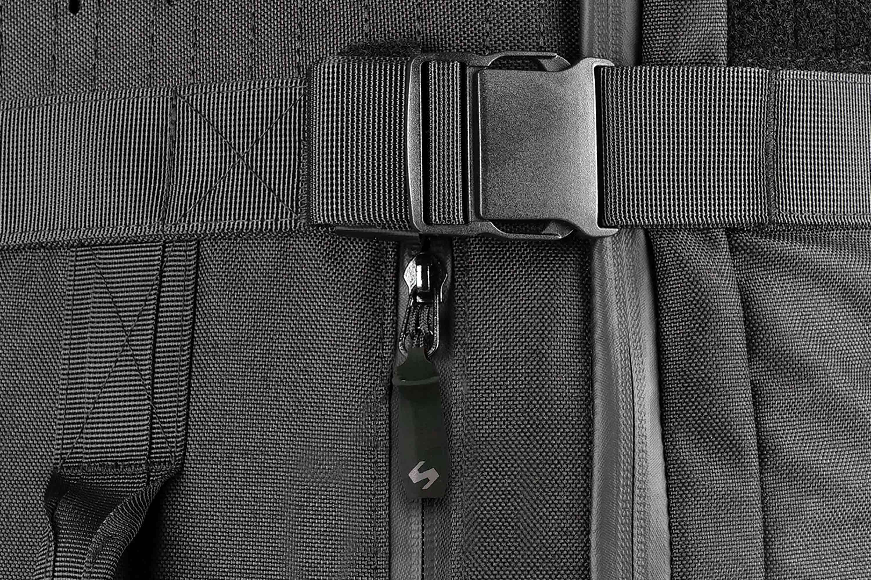 Die Tasche besteht aus strapazierfähigem 1000D Nylon mit dreilagiger PU-Beschichtung und bietet dadurch eine hohe Widerstandsfähigkeit gegen Abnutzung, Feuchtigkeit und äußere Einflüsse. Wasserabweisende Reißverschlüsse unterstützen den Schutz des Inhalts zusätzlich.
