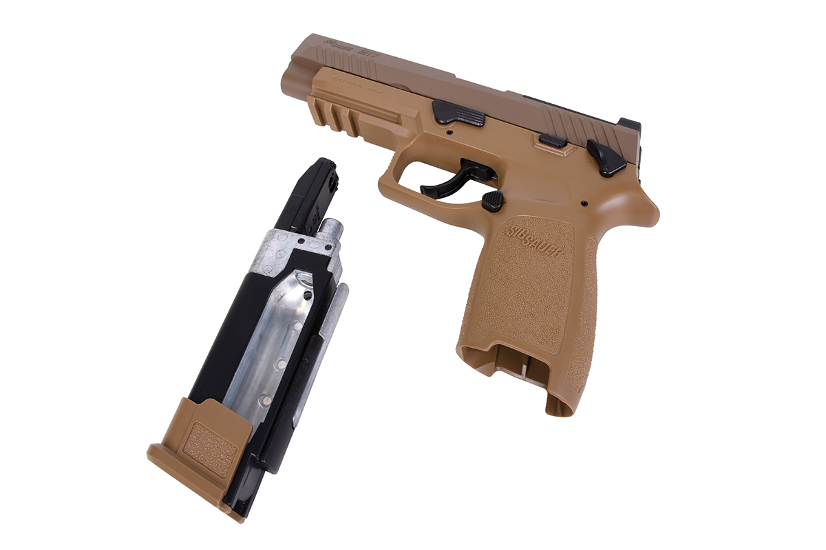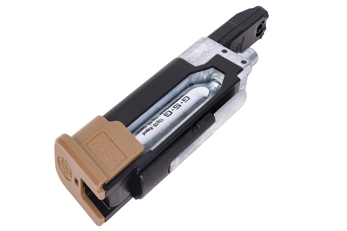 Der Nachbau aus dem Hause Sig Sauer besteht aus hochwertigem Kunststoff sowie einem Metallschlitten und verfügt über ein innovatives 20 Schuss RPM Ketten-Magazin, welches gleichzeitig mit der Co2-Kapsel im Griffstück Platz findet. Der Anstich der Kapsel erfolgt durch eine Hebelmechanik denkbar einfach ohne weiteres Werkzeug.