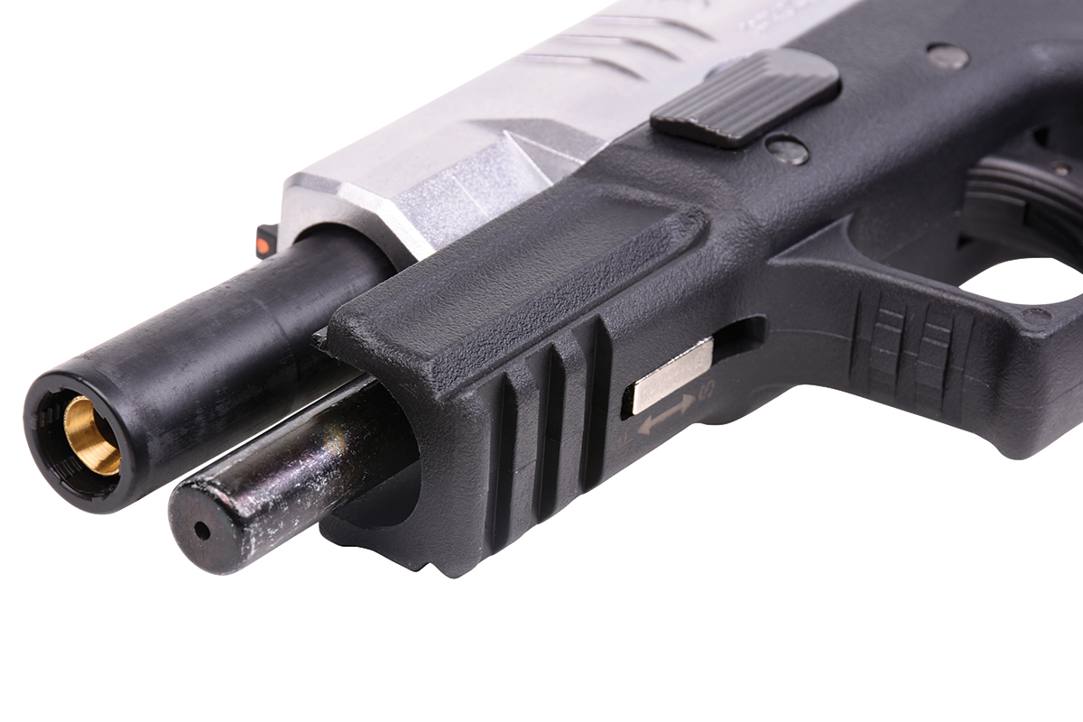 Die hochwertige lizensierte Replika aus dem Hause WE besteht wie das Original aus einem Polymerrahmen und einem Metallschlitten. Die Lieferung erfolgt inklusive drei wechselbaren Griffeinsätzen, um die Waffe optimal an die Hand des Schützen anzupassen. Weiterhin verfügt das Modell über eine Handballensicherung, eine Fiberglas-Visierung, eine Picatinny-Schiene und eine Abzugssicherung. Das einstellbare Spin-Up System sorgt für die nötige Präzision. Die Waffe kann einfach zerlegt werden und das BlowBack-System bietet ein reales Schießerlebnis.